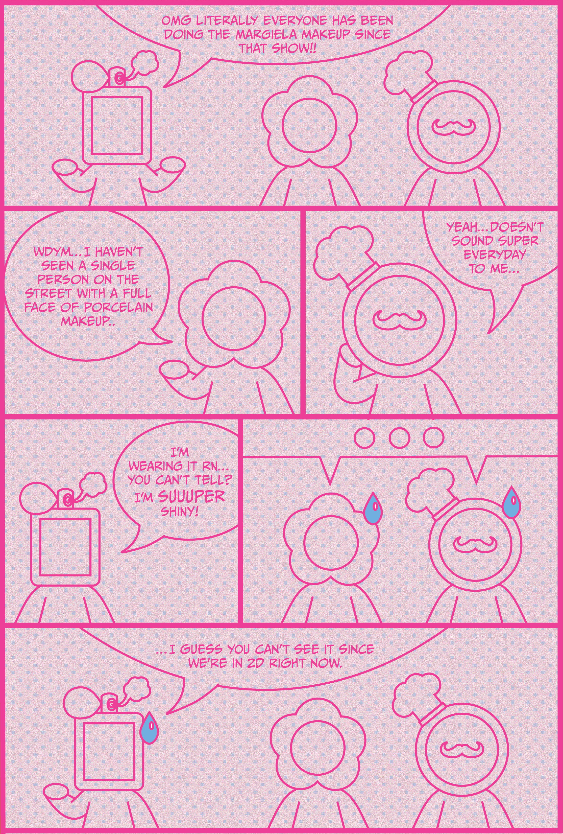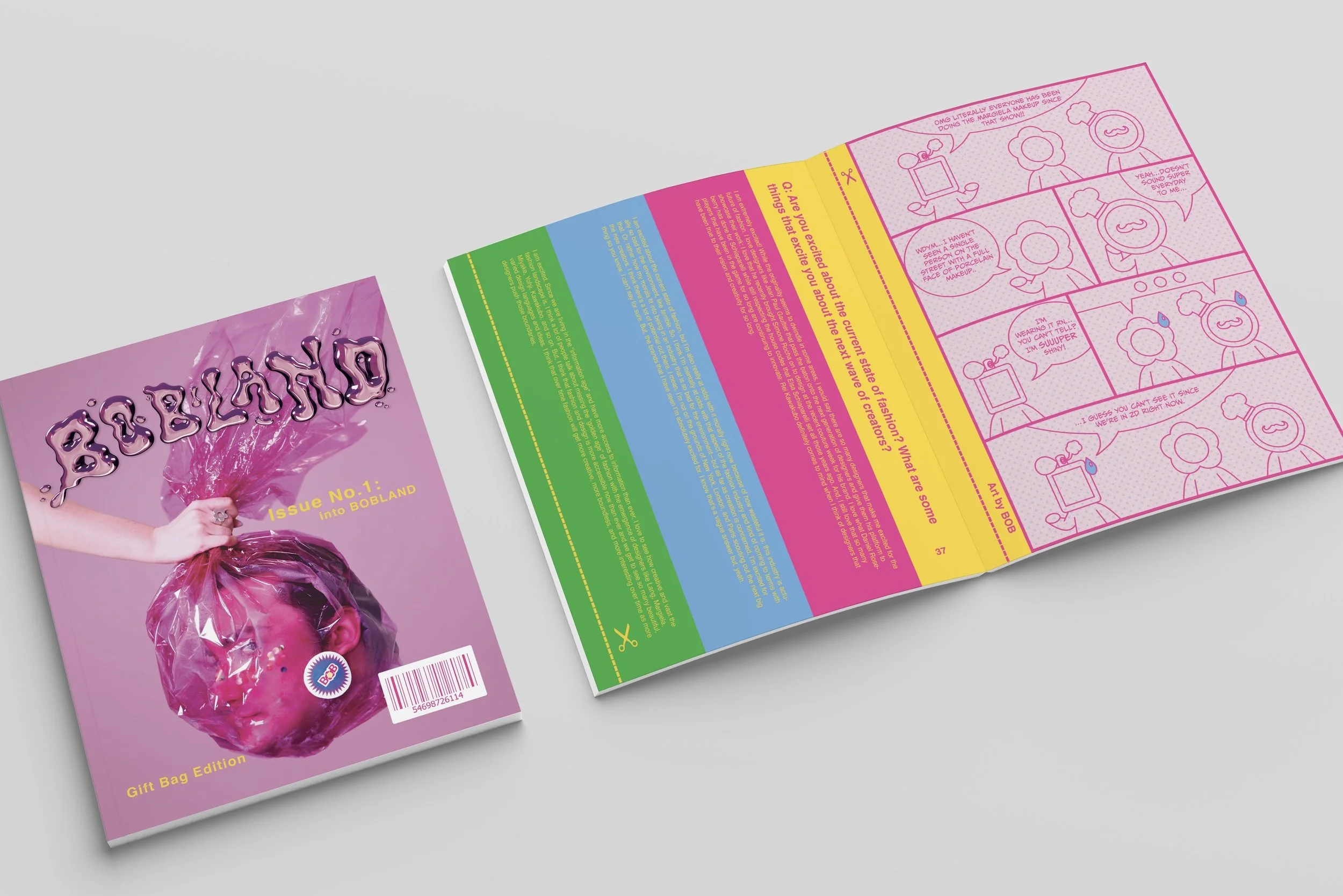 I took much inspiration from fantastical, vibrant, and even surreal artists to construct the world of BOBLAND such as Jeff Koons, Takashi Murakami, and Lisa Frank. I wanted the world to be cartoonish, eccentric, and surreal. At the time, I was really enjoying messing around with the 3D tools available in Illustrator to create these overly cute, fun, and whimsical illustrations that remind me of balloon animals. This effect became a motif we utilized throughout the first issue. I wrote the story and illustrated all the characters within this comic page; as BOBLAND is a fashion magazine, I wanted the silly plot of the comic book page to relate to topical fashion news of the time.