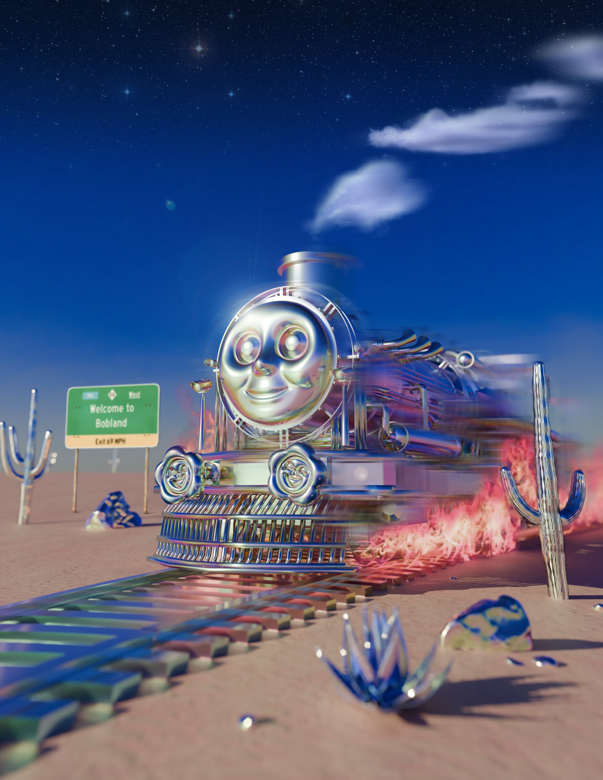Clad in complete chrome, the New Americana train moves through a desert echoing the likeness of Route 66 and a Harley Davidson wasteland. In this rugged Americana desert, even the cacti are metallic.